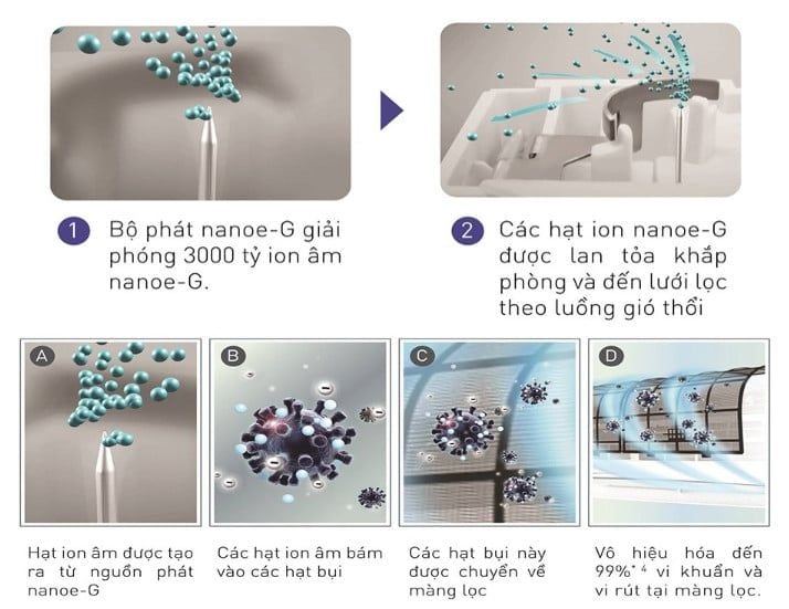 Nhờ bộ phát ion nanoe-G phát ra các ion âm vào không khí giúp giữ lại các hạt bụi có kích thước nhỏ như PM2.5, lọc bụi mịn để mang lại cho bạn một không gian sống sạch sẽ và thuần khiết.