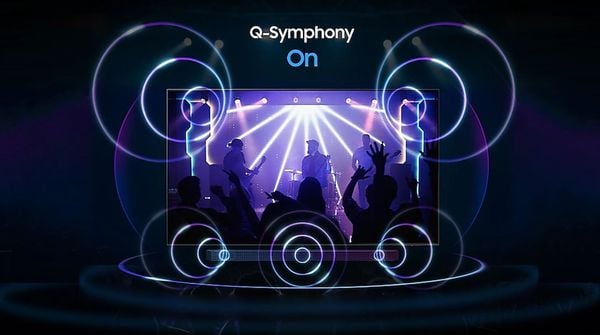 – Q-Symphony Next kết hợp loa tivi với loa thanh bằng AI, tạo ra không gian âm thanh sinh động như trong rạp chiếu phim.