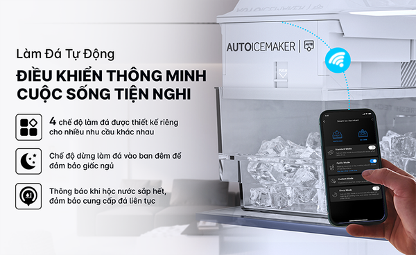 Tiết kiệm thời gian và công sức với chức năng làm đá tiện lợi và lưu trữ đá tự động. Hệ thống sẽ tự động làm đá khi bạn đổ nước vào bình chứa. Làm nhiều đá mà không cần nối đường cấp nước, không cần nhiều thao tác rắc rối. Bên cạnh đó, người dùng có thể tùy chọn 4 chế độ qua điện thoại nhanh chóng.