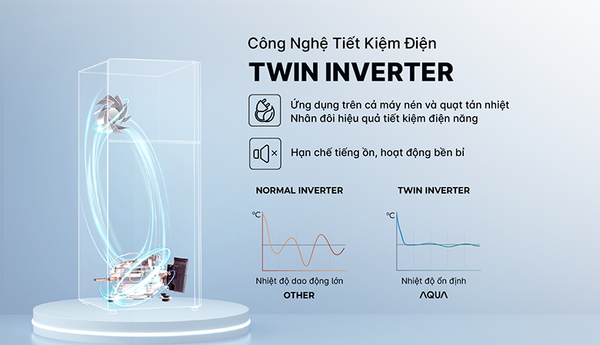 Công nghệ Twin Inverter được tích hợp trên tủ lạnh Aqua AQR-TA546FA(KGL)U1 cho khả năng tự động điều chỉnh hoạt động của máy nén với nhiều cấp độ, giúp duy trì nhiệt độ phù hợp, ổn định, làm lạnh nhanh chóng, vận hành êm ái, bền bỉ, tiết kiệm điện hiệu quả. Kết hợp Quạt Inverter hỗ trợ kiểm soát lượng khí lạnh được thổi đến các vị trí bên trong tủ tối ưu nhất nâng cao hiệu quả hoạt động.
