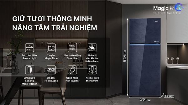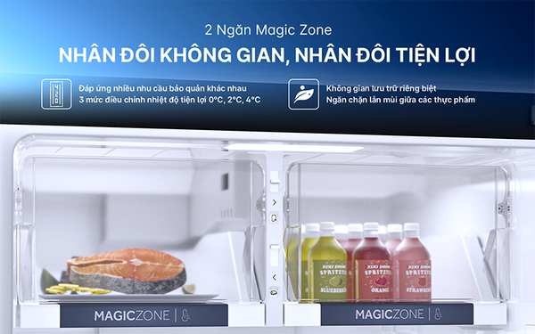 AQR-TA546FA(KGL)U1 được trang bị 2 ngăn Magic Zone thiết kế hộp kín trong ngăn mát ngăn lẫn mùi, giúp phân loại thực phẩm. Bên trong ngăn có khả năng tùy chỉnh linh hoạt 3 mức nhiệt độ 0˚C, 2˚C, 4˚C. Chế độ đông mềm bảo quản thịt cá tươi ngon, dễ dàng chế biến không cần rã đông.