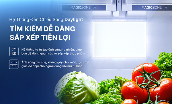 Hệ thống đèn chiếu sáng Day Light với luồng ánh sáng dịu nhẹ, không gây chói mắt, tạo cảm giác nhìn dễ chịu cho người dùng khi mở tủ, thuận tiện khi tìm kiếm và sắp xếp thực phẩm bên trong.